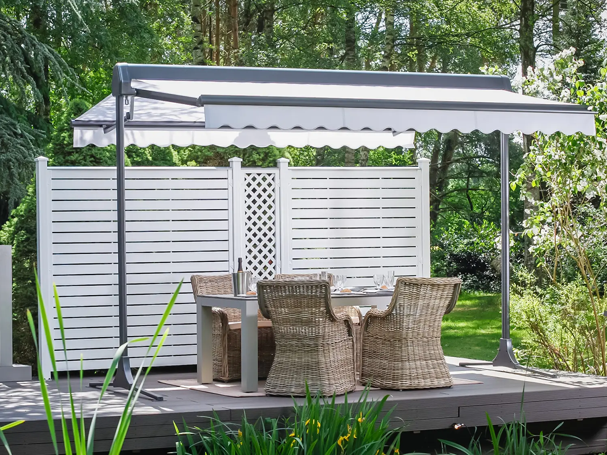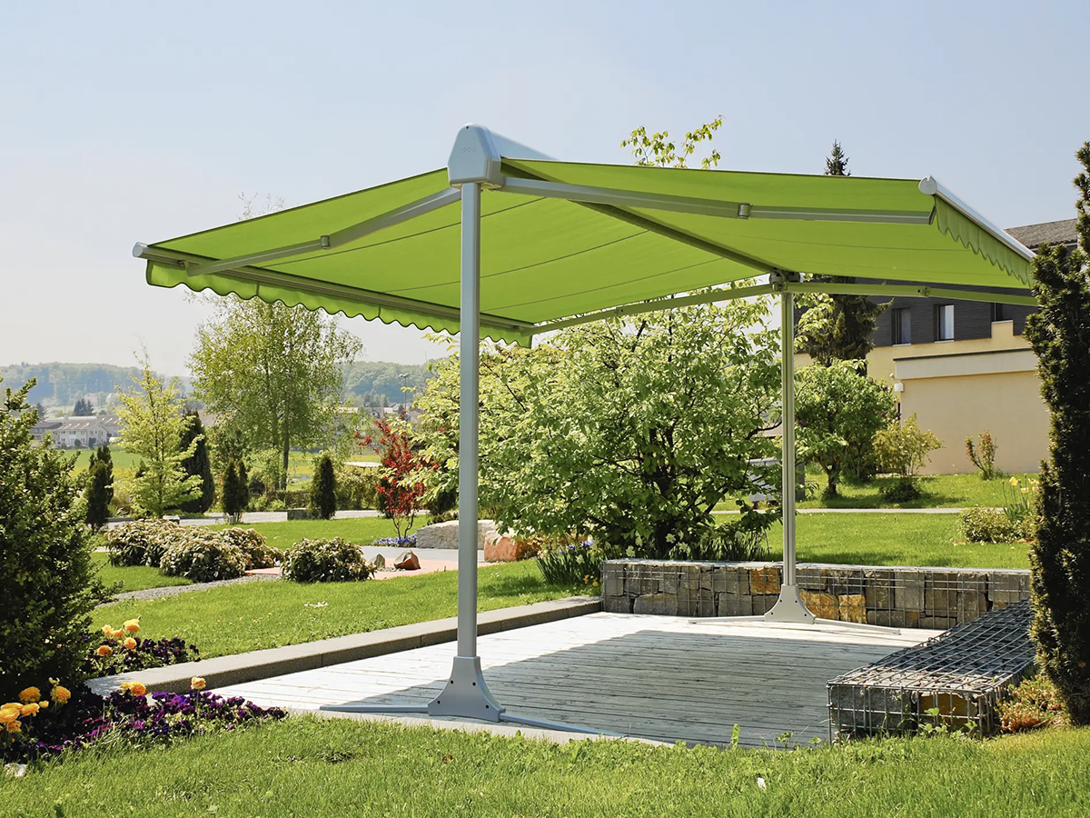 OMBRAMOBIL ist die freistehende Doppelmarkise für grosse Beschattungsflächen. Da keine Mittelstützen nötig sind, kann der Raum unter dieser Markise optimal genutzt werden. Zudem ist ein Auf- und Abbau in kürzester Zeit möglich.